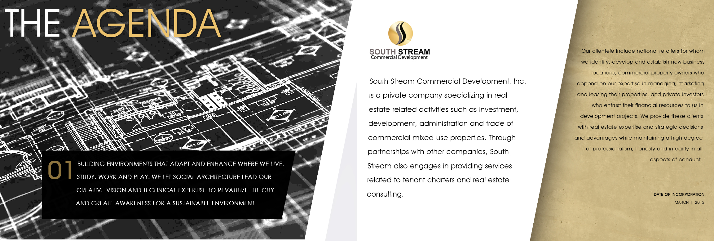 Company profile design for South Stream CDI, showcasing services, achievements, and brand identity through clean, professional layouts and visuals